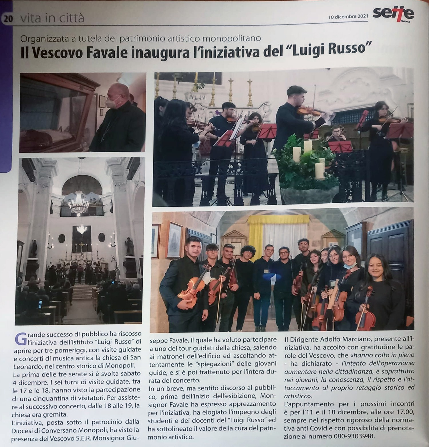 Grande successo di pubblico ha riscosso l’iniziativa dell’Istituto “Luigi Russo” di aprire per tre pomeriggi, con visite guidate e concerti di musica antica la chiesa di San Leonardo, nel centro storico di Monopoli. La prima delle tre serate si è svolta sabato 4 dicembre.