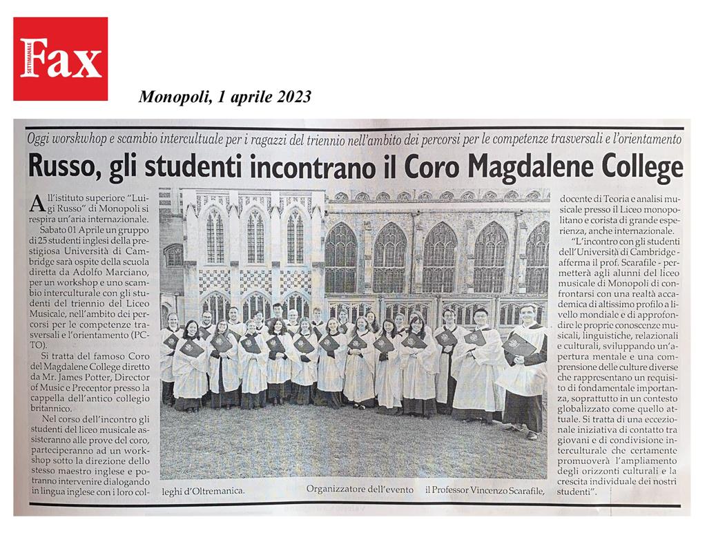 Luigi Russo, gli studenti incontrano il Coro Magdalene College — FAX Monopoli del 1 aprile 2023