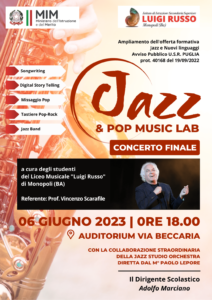 Il Liceo Musicale “Luigi Russo” di Monopoli, diretto da Adolfo Marciano, ospiterà la Jazz Studio Orchestra in un gran concerto di fine anno scolastico.