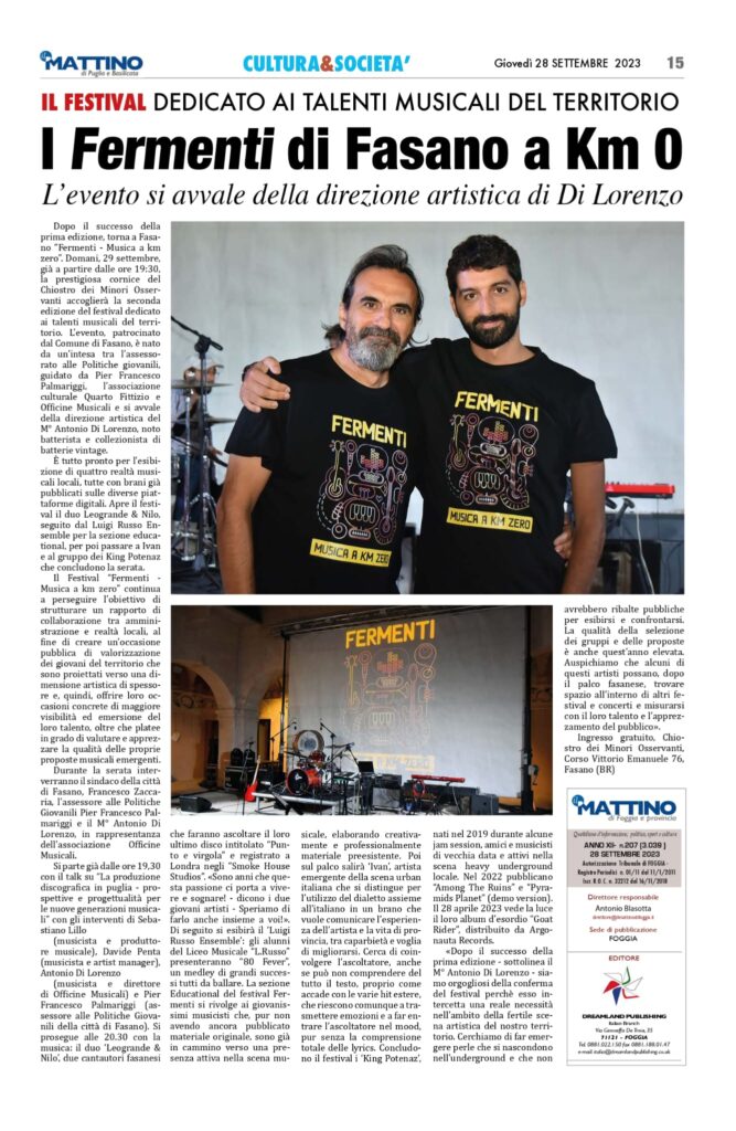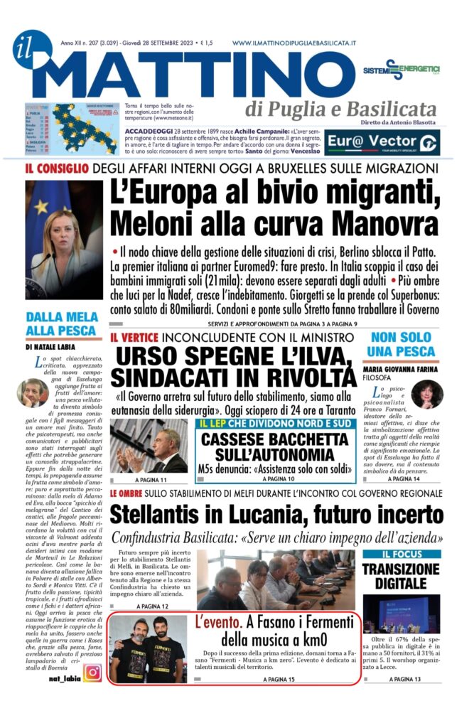 A Fasano “I fermenti della musica a Km0” — Il Mattino di Puglia e Basilicata del 28 settembre 2023