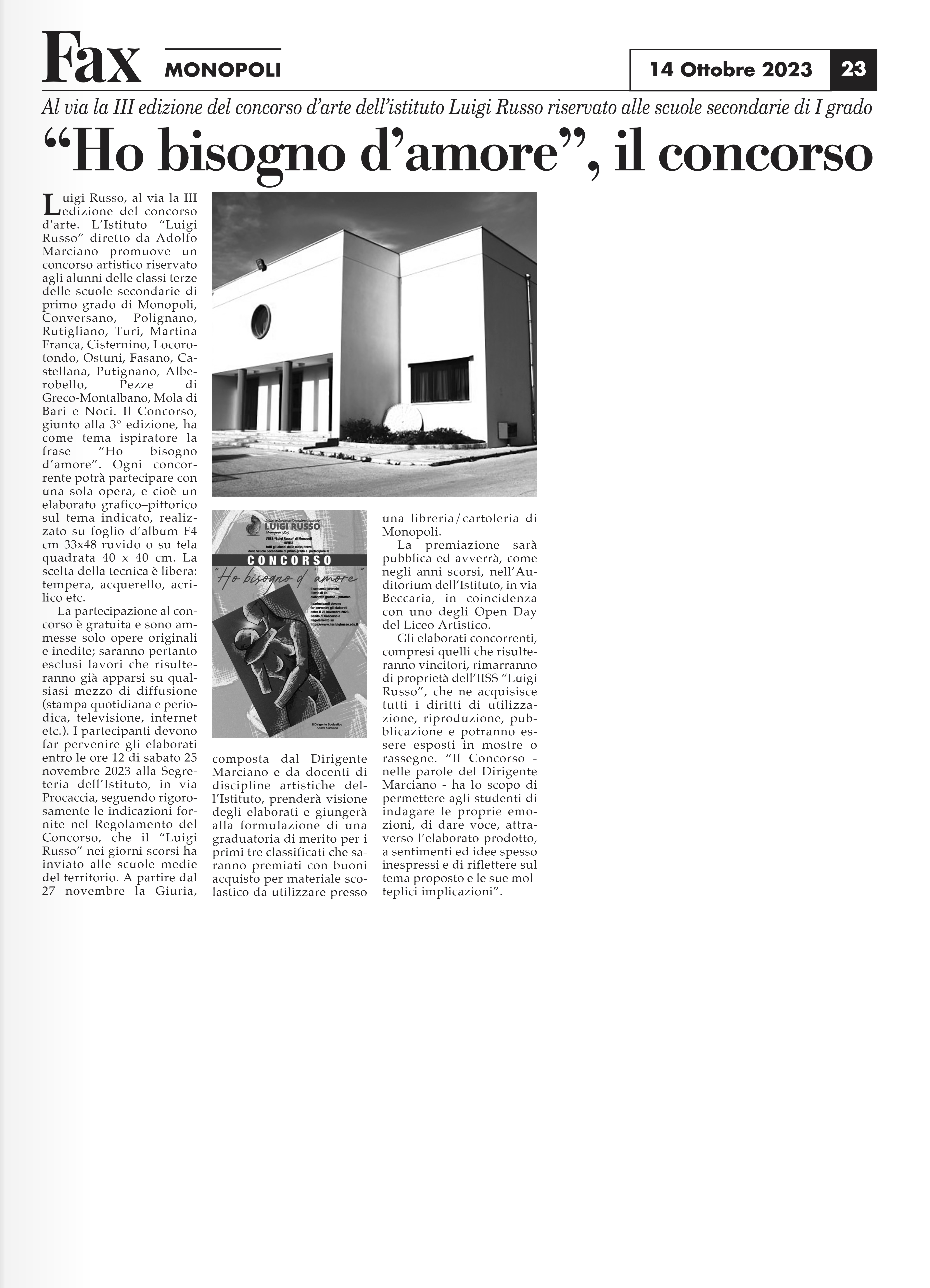 “Ho bisogno d’amore”, il concorso – FAX Monopoli del 14 ottobre 2023