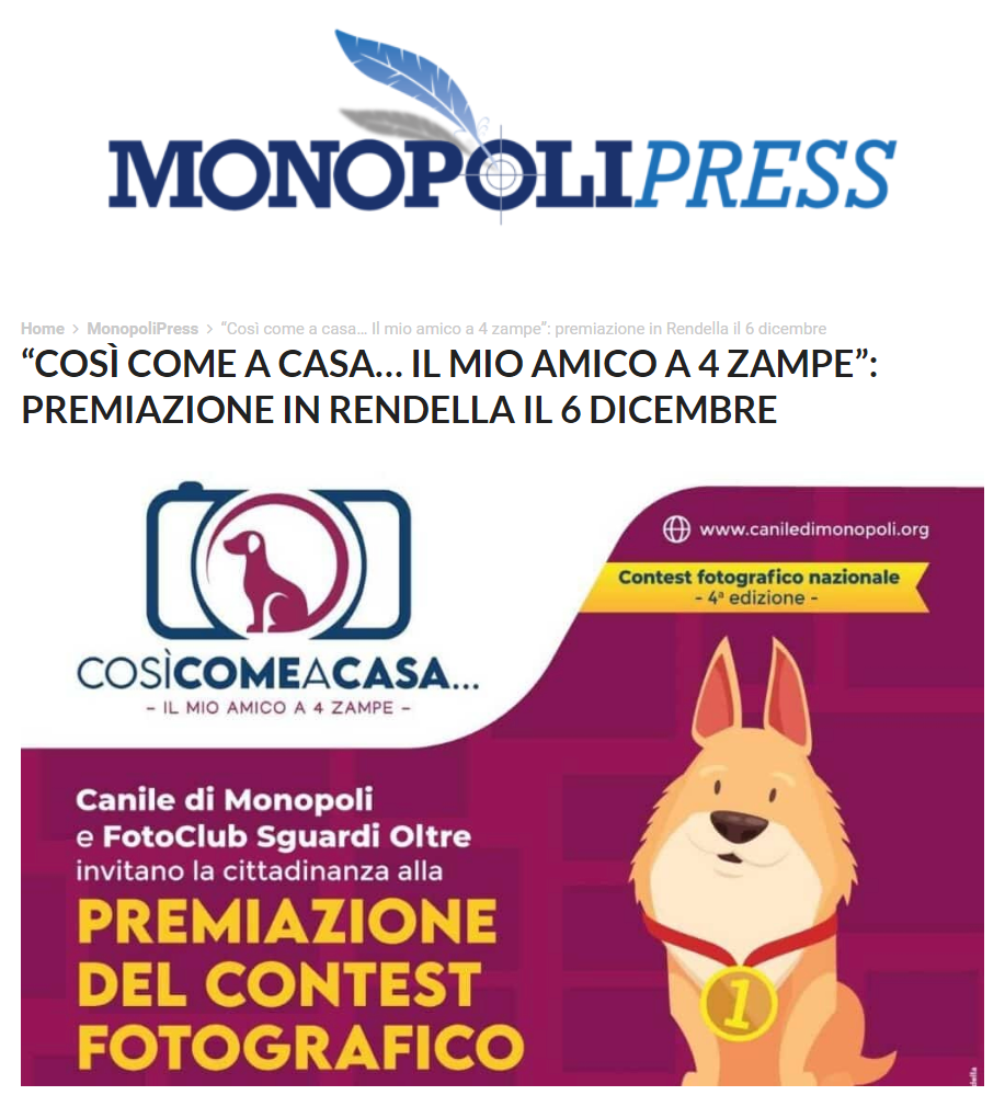 “COSÌ COME A CASA… IL MIO AMICO A 4 ZAMPE”: premiazione in Rendella il 6 dicembre – MonopoliPress del 5 dicembre 2023