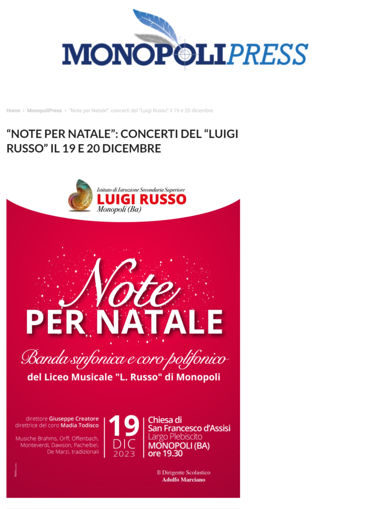 “Note per Natale”: Concerti del “Luigi Russo” il 19 e 20 Dicembre – MonopoliPress del 14 dicembre 2023