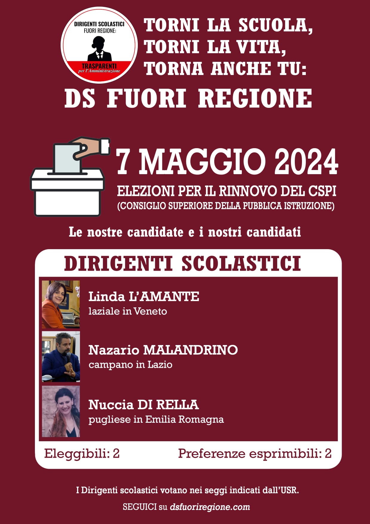 Elezioni CSPI del 7 maggio 2024 – Componente elettiva Dirigenti scolastici – Lista III: Torni la scuola, torni la vita, torna anche tu: DS fuori regione