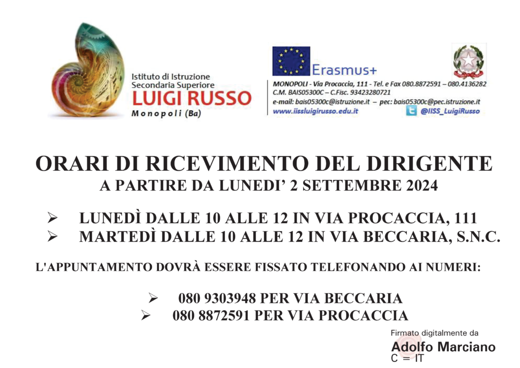 Orari di ricevimento del Dirigente – A.S. 2024/2025