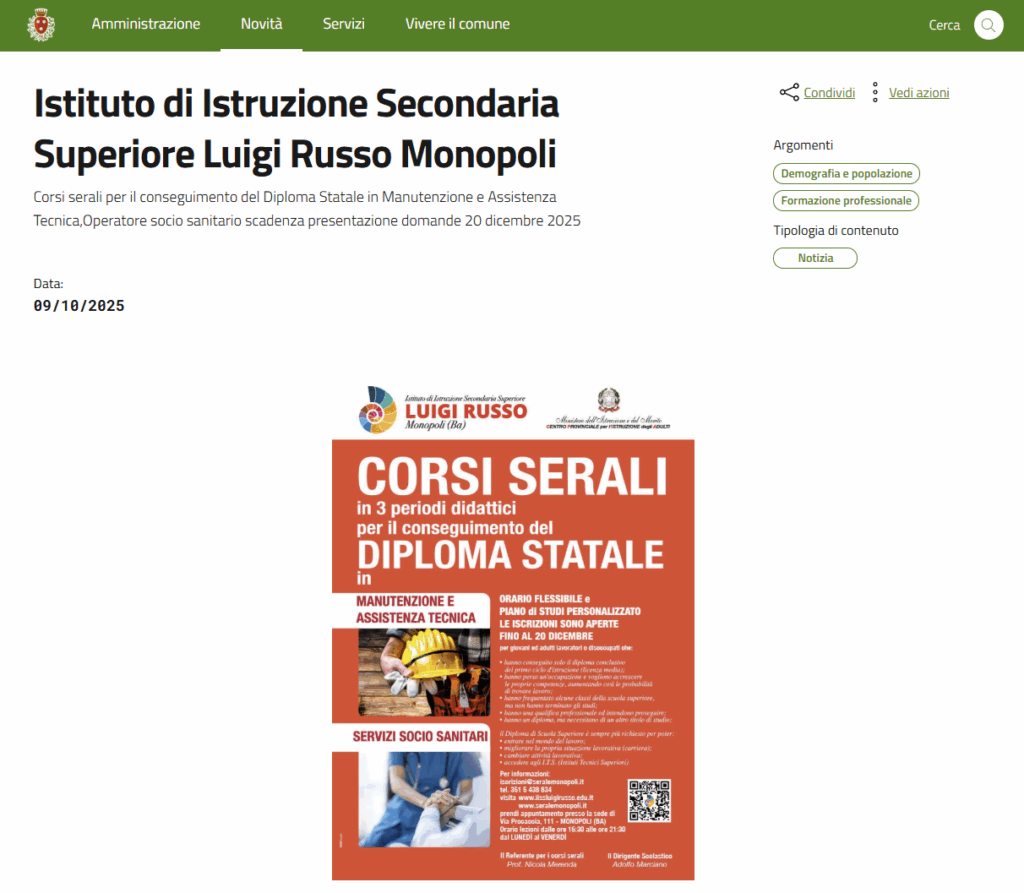 IISS “Luigi Russo”: corsi serali per adulti – Comune di Monopoli – 9 ottobre 2025