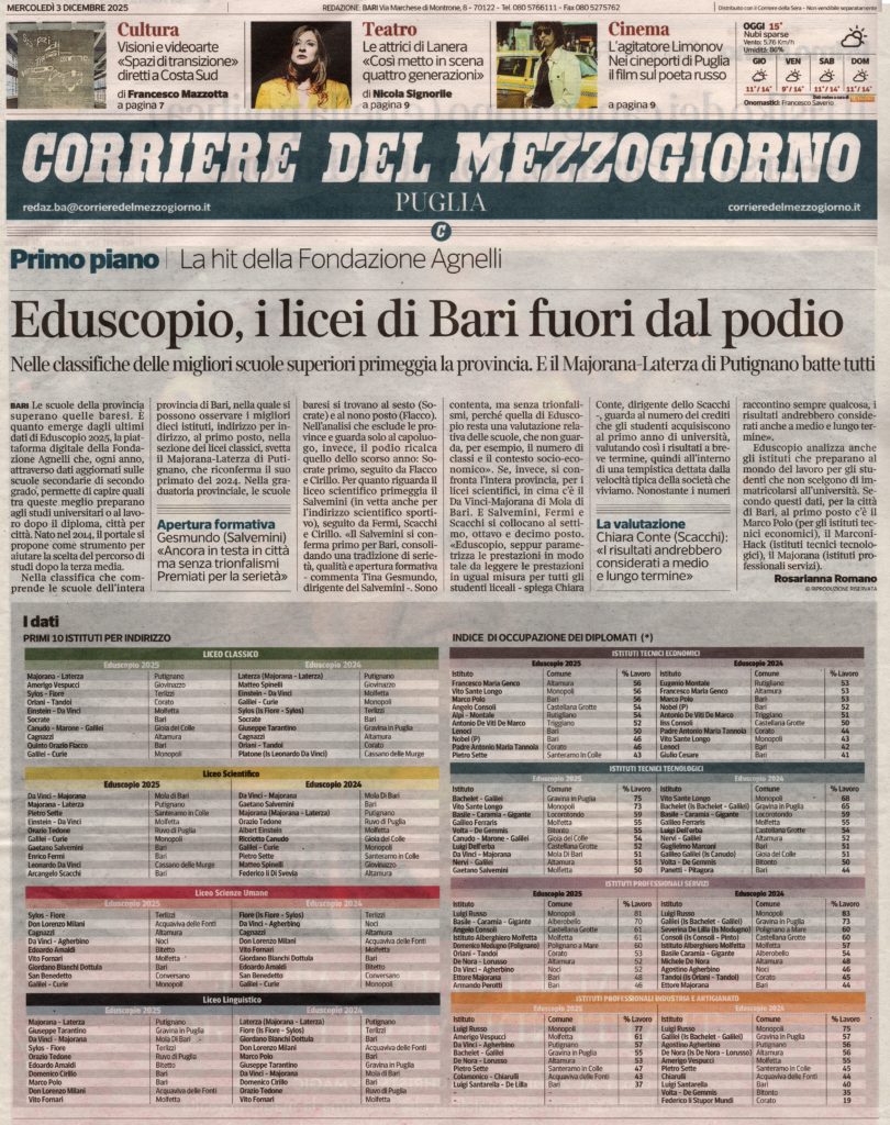 Eduscopio, i licei di Bari fuori dal podio – Corriere del Mezzogiorno del 3 dicembre 2025