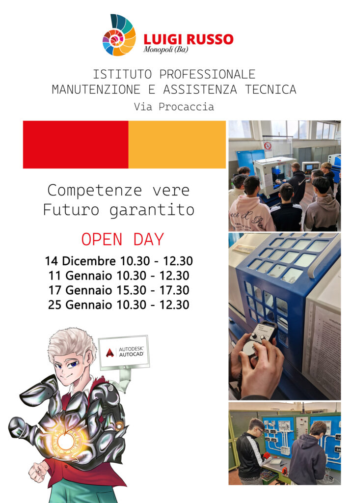 Nell’ambito dell’ampliamento e del rafforzamento dell’offerta formativa, l’IISS “Luigi Russo” di Monopoli promuove, a partire dall’a.s. 2026/2027, l’attivazione di una filiera formativa tecnologico-professionale articolata secondo il modello 4+2, con un percorso quadriennale di istruzione professionale nell’indirizzo Manutenzione e Assistenza Tecnica.
