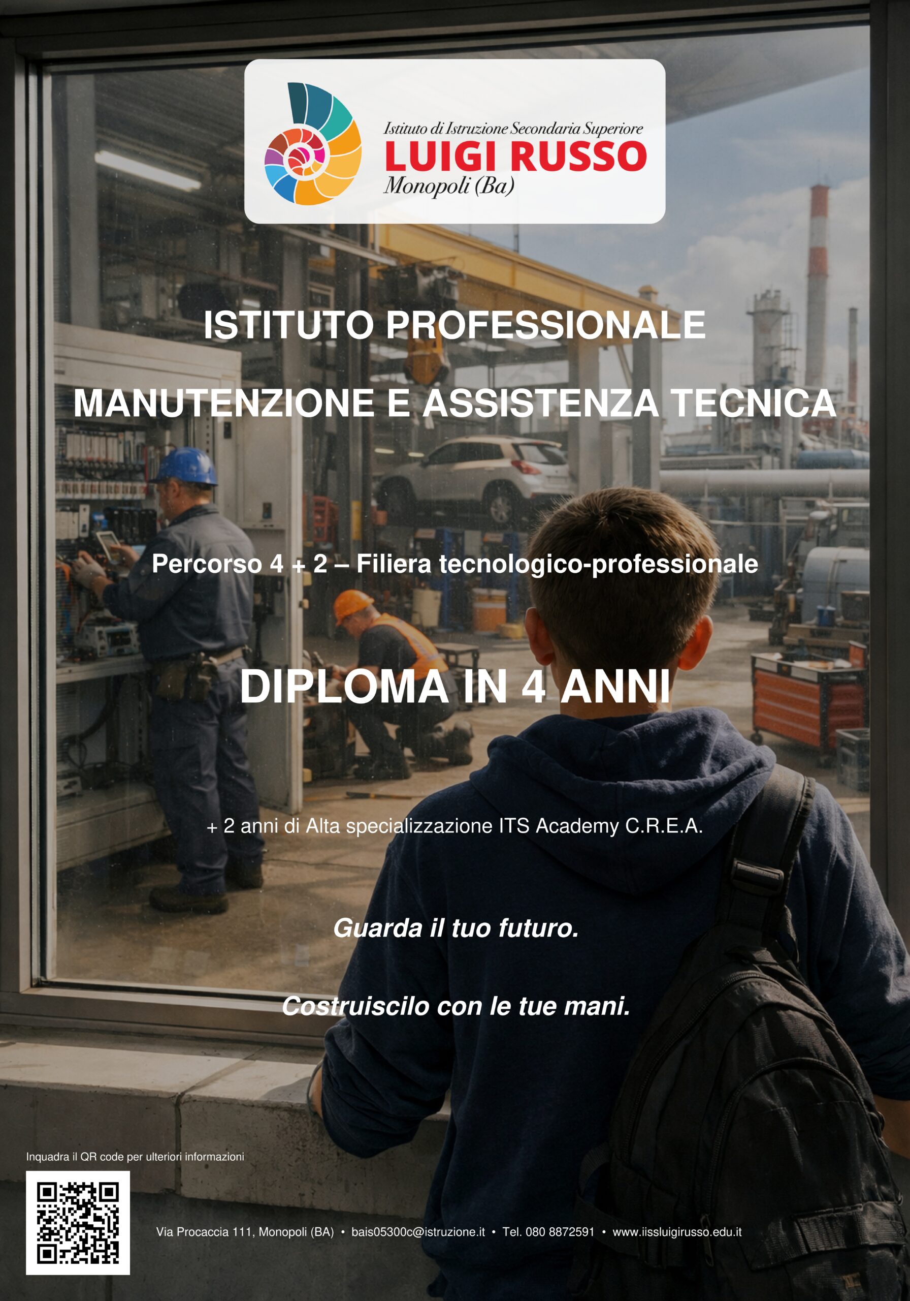 Nell’ambito dell’ampliamento e del rafforzamento dell’offerta formativa, l’IISS “Luigi Russo” di Monopoli promuove, a partire dall’a.s. 2026/2027, l’attivazione di una filiera formativa tecnologico-professionale articolata secondo il modello 4+2, con un percorso quadriennale di istruzione professionale nell’indirizzo Manutenzione e Assistenza Tecnica.